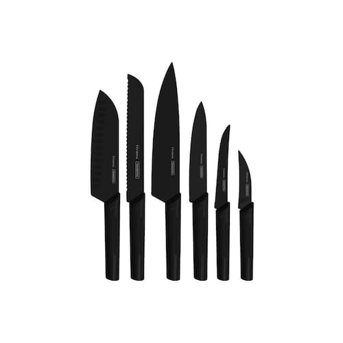 Ele é um jogo diferenciado e possui peças desenvolvidas com o melhor da tecnologia Tramontina: suas lâminas são em aço inox com revestimento em preto e têm maior durabilidade do fio devido ao tratamento térmico; os cabos de polipropileno contam com textura especial que proporcionam um manuseio extremamente agradável e diferenciado.