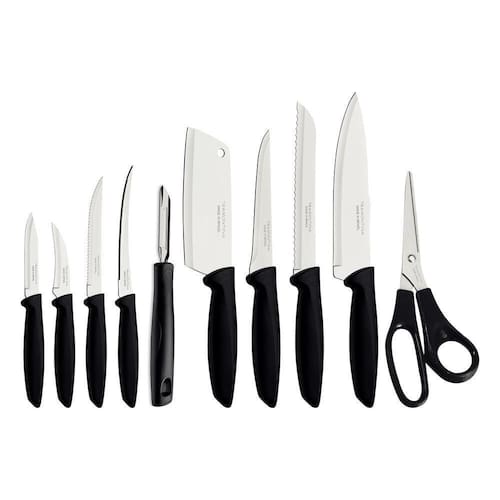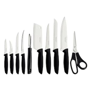 Sua cozinha ganhará maior funcionalidade e versatilidade com o jogo de facas Tramontina Plenus com lâminas em aço inox e cabos de polipropileno preto 10 peças. Com peças essencias para o preparo das suas refeições do dia a dia, como facas, cutelo, descascador e tesoura, ele vai deixar o preparo de suas receitas ainda mais fácil. As lâminas das peças são produzidas em aço inox com tratamento térmico e cabos de polipropileno, garantem alto poder de corte, resistência e maior durabilidade. Um jogo que ainda pode ser levado à máquina de louças e que vai facilitar suas tarefas, seja na hora de cozinhar ou limpar!