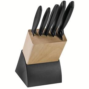 INFORMAÇÕES GERAIS DO JOGO DE FACAS TRAMONTINA COM LÂMINAS EM AÇO INOX CABOS DE POLIPROPILENO PRETO E SUPORTE DE MADEIRA 6 PEÇAS - As lâminas de aço inox têm maior durabilidade do fio devido ao tratamento térmico. - Os cabos de polipropileno possuem maior resistência e durabilidade. - Suporte de madeira e polipropileno. - Podem ir à máquina de lavar louças facilitando seu dia a dia.