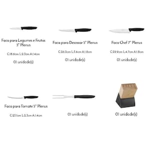 Jogo De Facas Tramontina Plenus Aço Inox E Polipropileno Preto E Suporte De Madeira 6 Peças 23498028 JOGO DE FACAS TRAMONTINA PLENUS COM LÂMINAS EM AÇO INOX CABOS DE POLIPROPILENO PRETO E SUPORTE DE MADEIRA 6 PEÇAS 23498028 Marca: Tramontina Modelo: Plenus com Lâminas em Aço Inox Cabos de Polipropileno Preto e Suporte de Madeira 6 Peças da Linha Plenus 23498/028 CONTEÚDO DO JOGO 1 Suporte de Madeira 1 Faca Chef 7 Plenus 1 Faca para Desossar 5 Plenus 1 Faca para Legumes e Frutas 3 Plenus 1 Faca para Tomate 5 Plenus 1 Garfo trinchante Plenus