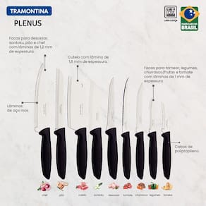 Descrição Com o jogo de facas Tramontina Plenus com lâminas em aço inox e cabos de polipropileno preto 9 peças, você terá a solução completa de facas para utilizar nos mais diversos tipos de cortes e ocasiões gastronômicas. As peças combinam com qualquer cozinha e a deixam mais bonita e clássica, pois seus cabos são na elegante cor preta. As lâminas produzidas em aço inox por terem sido submetidas a tratamento térmico, oferecem maior durabilidade e resistência. Elas são fáceis de limpar e podem ser lavadas na máquina de lavar louças. Com peças únicas e de muita importância na cozinha, o jogo de facas é a escolha perfeita para você. Facas de qualidade e beleza você encontra com a Tramontina!