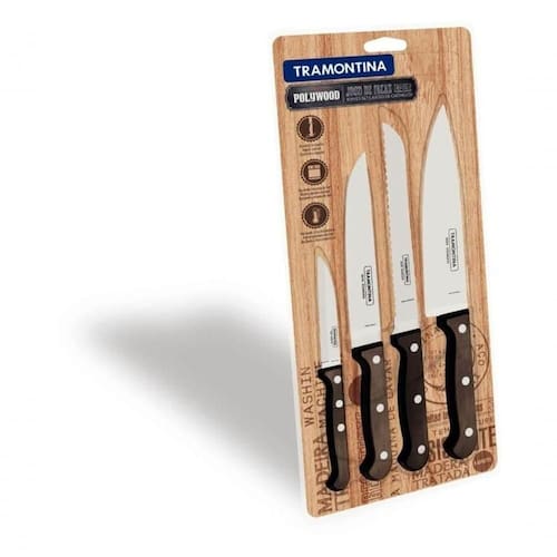Com o jogo de facas Tramontina Polywood com lâminas em aço inox e cabos de madeira tratada castanho 4 peças será ainda mais fácil preparar todas as suas receitas favoritas. Com esse jogo você fará bonito no dia a dia ou até mesmo naquela ocasião especial com a família. As facas são produzidas com lâminas em aço inox, lhe conferindo alta resistência e qualidade. Os cabos são produzidos com madeira tratada polywood, um material durável que resiste à impactos e altas temperaturas. Tenha uma cozinha completa com a linha Tramontina Polywood!