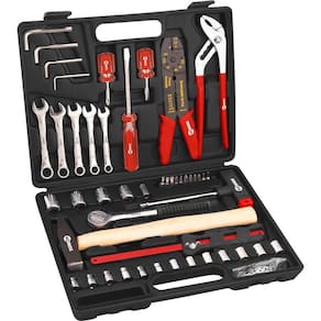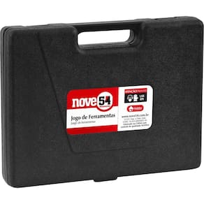1 Jogo de ferramentas, composto por maleta plástica com 99 peças em aço carbono, sendo: 2 chaves de fenda (6 mm x 40 mm e 6 mm x 100 mm), 1 chave phillips 6 mm x 40 mm, 4 chaves allen (3 mm, 4 mm, 5 mm e 6 mm), 5 chaves combinadas (8 mm, 9 mm, 10 mm, 11 mm e 12 mm), 1 alicate multiuso, 1 alicate bomba d'Água, 1 martelo pena 300 g, 1 miniarco de serra, 4 soquetes sextavados encaixe 3/8 (14 mm, 15 mm, 16 mm e 17 mm), 13 soquetes sextavados encaixe 1/4 (4 mm - 4,5 mm - 5 mm - 5,5 mm, 6 mm - 6,5 mm - 7 mm - 8 mm - 9 mm - 10 mm - 11 mm - 12 mm e 13 mm), 1 catraca, 1 chave T, 1 soquete adaptador, 11 ponteiras e 53 terminas elétricos diversos
