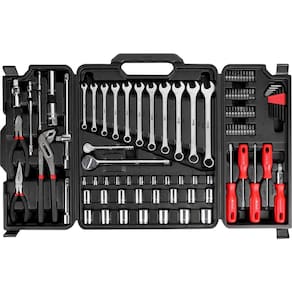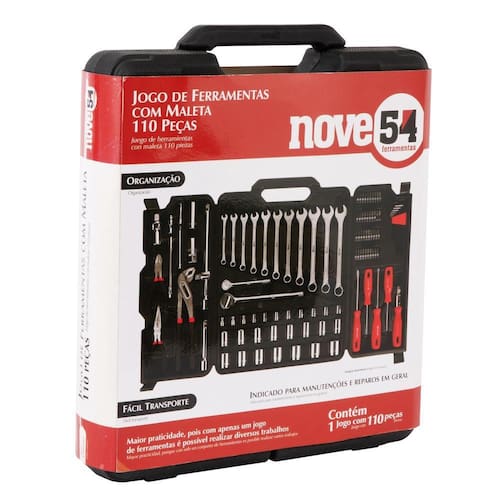 1 Jogo de ferramentas, composto por 110 peças, sendo: 1 maleta plástica, 1 porta-chaves allen/hexagonais, 4 porta-bits, 1 alicate corte diagonal 6" em aço carbono, 1 alicate de bico meia-cana 6" em aço carbono, 1 alicate bomba d'água 10" em aço carbono, 2 chaves de fenda em aço carbono (5,0 mm x 75 mm (3/16" x 3") e 6,3 mm x 100 mm (1/4" x 4")), 2 chaves phillips em aço carbono (5,0 mm x 75 mm (N 1 - 3/16" x 3") e 6,3 mm x 100 mm (N 2 - 1/4" x 4")), 8 chaves allen/hexagonais aço carbono (1,5 mm, 2 mm, 2,5 mm, 3 mm, 4 mm, 5 mm, 5,5 mm e 6 mm), 11 chaves combinadas (8 mm, 9 mm, 10 mm, 11 mm, 12 mm, 13 mm, 14 mm, 15 mm, 17 mm, 18 mm e 19 mm), 15 soquetes encaixe 1/2" em aço carbono (10 mm, 11 mm, 12 mm, 13 mm, 14 mm, 15 mm, 17 mm, 18 mm, 19 mm, 20 mm, 21 mm, 22 mm, 23 mm, 24 mm e 27 mm), 1 catraca encaixe 1/2", 1 extensão 5" em aço carbono encaixe 1/2", 1 junta universal em aço carbono encaixe 1/2", 1 cabo t em aço carbono encaixe 1/2" x 10, 2 soquetes para vela de ignição em aço carbono (16 mm e 21 mm), 11 soquetes em aço carbono encaixe 1/4" (4 mm, 5 mm, 6 mm, 7 mm, 8 mm, 9 mm, 10 mm, 11 mm, 12 mm, 13 mm e 14 mm), 1 catraca encaixe 1/4", 1 extensão em aço carbono 2" encaixe 1/4", 1 extensão em aço carbono 4" encaixe 1/4", 1 extensão flexível 6" em aço carbono encaixe 1/4", 1 junta universal em aço carbono encaixe 1/4", 1 cabo adaptador para bits com catraca em aço carbono encaixe 1/4", bits fabricados em 40Cr com encaixe 1/4" sendo: 7 fenda (3,5 mm (2 peças), 4 mm (2 peças), 5,5 mm, 6,5 mm e 8 mm)), 8 phillips (N 0, N 1, N 2 e N 3 (2 peças cada)), 6 allen (2 mm, 3 mm, 4 mm, 5 mm, 6 mm e 7 mm), 3 quadrados (S1, S2 e S3), 7 hexalobular (T10, T15, T20, T25, T27, T30 e T40), 3 pozidrive (PZ1, PZ2 e PZ3), 4 três pontas (1, 2, 3 e 4) e 2 adaptadores.