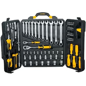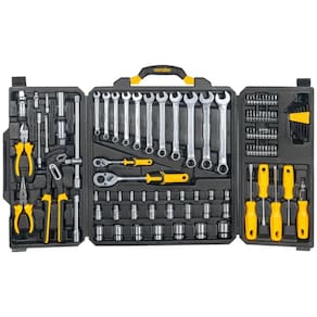 Tipo de ferramentas: Alicates, chaves de fenda, chaves philips, chaves allen, chaves combinada, soquetes sextavados, catacra, extensão, junta universal, cabo T, soquetes para velas de ignição, cabo adaptador para bits, bits magnéticos, chaves quadrados, chaves hexalobular e chaves pozidrive.