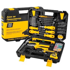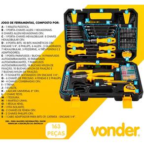 1 Jogo de ferramentas, composto por 163 peças, sendo: 1 maleta, 1 porta-chaves allen/hexagonais, 1 porta-chaves hexalobular, 4 porta-bits, 1 porta-parafusos/buchas, 11 soquetes sextavados em aço cromo vanádio encaixe 1/4" (4 mm, 5 mm, 6 mm, 7 mm, 8 mm, 9 mm, 10 mm, 11 mm, 12 mm, 13 mm e 14 mm), 6 chaves de precisão (4 fenda (1,4 mm, 2 mm, 2,4 mm, 3 mm) e 2 Phillips (PH0 e PH1)), 8 chaves allen/hexagonais em aço cromo vanádio (1,5 mm, 2 mm, 2,5 mm, 3 mm, 4 mm, 5 mm, 5,5 mm e 6 mm), 8 chaves hexalobular em aço cromo vanádio (T9, T10, T15, T20, T25, T27, T30 e T40), 4 chaves combinadas aço cromo vanádio (8 mm, 10 mm, 12 mm e 14 mm), 1 trena 3 m, 1 estilete 18 mm, 3 lâminas para estilete, 1 alicate universal 8" em aço cromo vanádio, 1 chave teste, 1 tesoura 210 mm, 1 martelo unha 20 mm, 1 régua nível, 1 fita isolante 5 m, 2 chaves de fenda em aço cromo vanádio (5 mm x 75 mm (3/16" x 3") e 6,3 mm x 100 mm (1/4" x 4")), 2 chaves phillips em aço cromo vanádio (5,0 mm x 75 mm (n°1 - 3/16" x 3") e 6,3 mm x 100 mm (n°2 - 1/4" x 4")), 1 cabo adaptador para bits com catraca encaixe 1/4", 14 parafusos autoatarraxantes (3 mm x 19 mm, cabeça chata, phillips), 10 parafusos autoatarraxantes (3,6 mm x 25 mm, cabeça chata, phillips), 7 parafusos autoatarraxantes (4 mm x 30 mm, cabeça chata, phillips), 14 buchas nylon de fixação 5 mm, 10 buchas nylon de fixação 6 mm, 7 buchas nylon de fixação 7 mm, 40 bits magnéticos em aço cromo vanádio encaixe 1/4" ((7 fenda (3,5 mm (2 peças), 4 mm (2 peças), 5,5 mm, 6,5 mm e 8 mm), 8 phillips (n° 0, n° 1, n° 2 e n° 3 (2 peças cada)), 6 allen (2 mm, 3 mm, 4 mm, 5 mm, 6 mm e 7 mm), 3 quadrados (S1, S2 e S3), 7 hexalobular (T10, T15, T20, T25, T27, T30 e T40), 3 pozidrive (PZ1, PZ2 e PZ3), 4 três pontas (1, 2, 3 e 4) e 2 adaptadores).