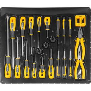 1 Jogo de ferramentas, composto por 38 peças, sendo: 5 chaves de fenda em aço cromo vanádio (1/8 x 3, 3/16 x 4, 1/4" x 1.1/2", 1/4 x 4 e 5/16 x 8, ), 5 chaves phillips em aço cromo vanádio (1/8 x 3, 3/16 x 4, 1/4 x 1.1/2, 1/4 x 4 e 5/16 x 6), 18 bits em aço cromo vanádio encaixe 1/4", sendo, 4 fenda (3 mm, 4 mm, 5 mm e 6 mm), 4 phillips (PH0, PH1, PH2 e PH3), 4 pozidrive (PZ0, PZ1, PZ2 e PZ3) e 6 hexalobular (T10, T15, T20, T25, T27 e T30), 6 chaves de precisão, sendo, 3 fenda (2 mm, 2,4 mm e 3 mm) e 3 phillips (2 mm, 2,4 mm e 3 mm), 1 desmagnetizador/magnetizador, 1 cabo adaptador de bits encaixe sextavado 1/4", 1 alicate de bico meia cana reto 6" isolação 1.000 V em aço cromo vanádio e 1 alicate universal 6 isolação 1.000 V em aço cromo vanádio.