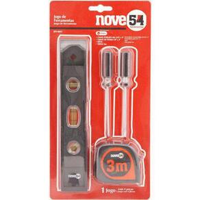 Jogo de ferramentas com 4 pecas jfn 041 954 3599000041 Conteúdo da embalagem: 1 jogo de ferramentas com 4 peças, sendo: 1 nível plástico 9, 1 chave de fenda aço carbono 1/8 x 3, 1 chave de fenda cruzada/phillips aço carbono 1/8 x 3 e 1 trena 3 m
