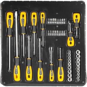 1 Jogo de ferramentas, composto por 49 peças, sendo: 5 chaves de fenda em aço cromo vanádio (1/8 x 3, 3/16 x 4, 1/4 x 1.1/2, 1 /4 x 4 e 5/16 x 8), 5 chaves phillips em aço cromo vanádio (1/8 x 3, 3/16 x 4, 1/4 x 1.1/2, 1/4 x 4 e 5/16 x 6), 19 bits em aço cromo vanádio encaixe 1/4, sendo, 5 fenda (3 mm, 4 mm, 5 mm, 6 mm e 7 mm), 4 phillips (PH0, PH1, PH2 e PH3), 4 pozidrive (PZ0, PZ1, PZ2 e PZ3) e 6 hexalobular (T10, T15, T20, T25, T27 e T30), 1 adaptador de encaixe quadrado para sextavado, 1 cabo adaptador de bits sextavado 1/4, 9 soquetes sextavados em cromo vanádio encaixe 1/4 (3/16, 1/4, 9/32, 5/16, 11/32, 3/8, 7/16, 15/32 e 1/2), 9 soquetes sextavados em aço cromo vanádio encaixe 1/4 (5 mm, 6 mm, 7 mm, 8 mm, 9 mm, 10 mm, 11 mm, 12 mm e 13 mm)