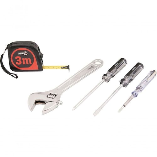 Jogo De Ferramentas Com 5 Peças Aço Carbono Jf043 - Nove54 Conteúdo da embalagem 1 Jogo de ferramentas com 5 peças, sendo: 1 chave de fenda aço carbono 3/16 x 4, 1 chave de fenda cruzada/phillips aço carbono 3/16 x 4, 1 chave ajustável aço carbono cromada 8, 1 chave teste 1/8 x 5.1/2 e 1 trena 3 m Aplicações e dicas de uso Indicado para manutenções e reparos em geral. Uso leve. DETALHES TÉCNICOS