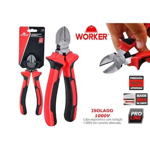 - 01 Alicate de Corte Diagonal 6, Isolação 1000V De acordo com Recomendação da NR-10 . Indicado para cortar e desencapar fios e cabos elétricos, além de arames. Produzido em Aço Carbono Especial Forjado e Temperado, proporcionando maior resistência e durabilidade. Possui cabo isolado Anatômico e Antiderrapante, com abas de proteção, que oferece maior conforto e segurança ao operador. Marca Worker.
