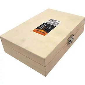 - 1 Broca de 10mm - 1 Broca de 15mm - 1 Broca de 20mm - 1 Broca de 25mm - 1 Broca de 35mm - 1 Caixa de madeira