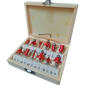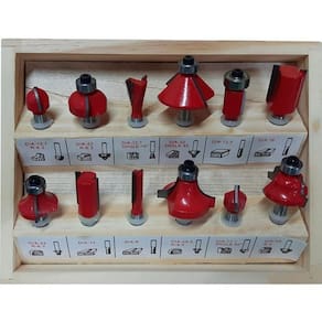 1 fresa rasgo em U com 12,7mm raio 6.3 1 fresa moldura arredondada com rolamento - 22mm raio 6.3 1 fresa rasgo de andorinha - 12,7mm ângulo 14º 1 fresa chanfro com rolamento - 32mm ângulo 45º 1 fresa acabamento de lâminas com rolamento - 12,7mm 3 fresas retas para acabamento e frisos, sendo: 1 com 6mm, 1 com 12mm e 1 com 16mm 2 fresas quebra canto com rolamento, sendo: 1 com 22mm raio 6.3 e 1 com 28.6 raio 9.5 1 fresa rasgo em V com 12,7mm ângulo 90º 1 fresa moldura romana com rolamento - 25mm raio 4.0