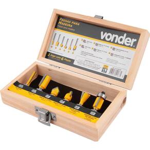 1 Jogo com 6 peças, sendo: 2 fresas retas 6 mm e 12 mm, 1 fresa para rasgo em V 12 mm, 1 fresa para rasgo em U 12 mm, 1 fresa rabo de andorinha 12 mm e 1 fresa com rolamento para acabamento em lâminas 12 mm.