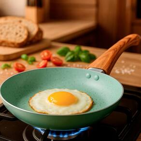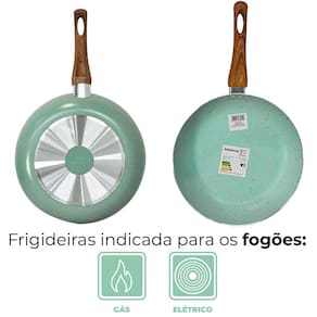 Com acabamento externo em tom verde sofisticado e cabos com design amadeirado em baquelite siliconado, cada peça se destaca não só pela estética, mas também pela praticidade. A estrutura de 2mm de espessura garante um aquecimento uniforme, cozinhando os alimentos de maneira mais eficiente e sem riscos de queimaduras localizadas.