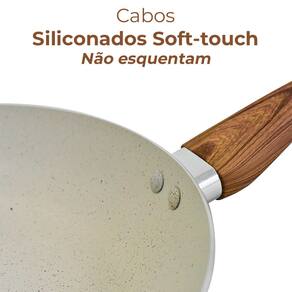 Os cabos anatômicos em baquelite siliconado oferecem segurança e conforto. O design sofisticado na cor bege com detalhes amadeirados vai dar um toque especial à sua cozinha.