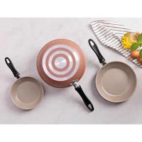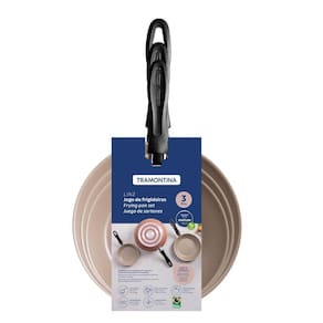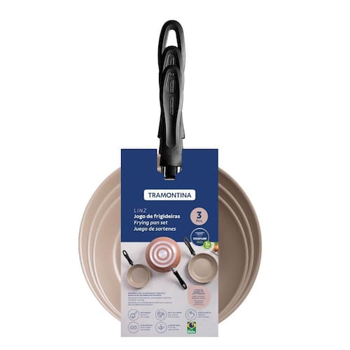 O jogo de frigideiras Tramontina Linz em alumínio com revestimento interno e externo em antiaderente Starflon Max mocaccino 03 peças garante praticidade e versatilidade para o preparo das refeições do dia a dia. Com corpo em alumínio e revestimento antiaderente interno e externo, proporciona cozimento rápido e uniforme, evita que os alimentos grudem e facilita a limpeza. Os cabos em baquelite antitérmico oferecem segurança durante o uso, pois não aquecem. Uma escolha eficiente para tornar sua rotina na cozinha ainda mais simples.