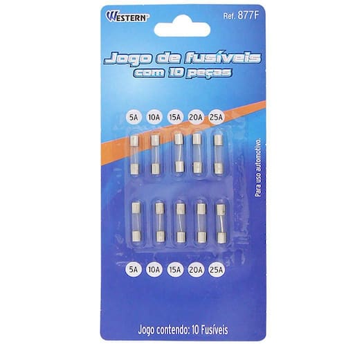 Descrição do Produto O fusível é muito importante para a segurança do automóvel, pois basta qualquer ameaça de curto-circuito que eles interrompem a energia. Por isso, eles são fundamentais e devem ser substituídos sempre que apresentarem algum defeito. - Para uso automotivo - Material: Vidro e latão niquelado - Contém 10 fusíveis: :: 2 peças: 5A :: 2 peças: 10A :: 2 peças: 15A :: 2 peças: 20A :: 2 peças: 25A Ean: 7897186077987