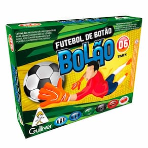 Jogo de Futebol de Botão - Bolão - 6 Times - Gulliver: coloque o coração na ponta dos dedos e comece uma disputa emocionante de futebol de botão! O Jogo de Botão Bolão é muito empolgante e divertido. Além de simular partidas de futebol, também estimula a imaginação e criatividades das crianças. Reúna família e amigos para disputas emocionantes de futebol de mesa com o jogo de Futebol de Botão Bolão da Gulliver. Como jogar futebol de botão? Regras: • Para o campo, escolha uma superfície lisa ou mesa de futebol de botão • Monte o goleiro, encaixando o botão na parte traseira • Para movimentar os jogadores, segure a palheta na vertical e pressione-a contra a borda do botão • Para jogar siga as regras tradicionais do futebol de botão de mesa ou combine com seus adversários suas próprias regras Informações: • Produto: Jogo de Botão Bolão 06 Times • Marca: Gulliver Brinquedos • Coleção: Bolão • Categoria: Jogos de Salão • Subcategoria: Futebol de Botão • Conteúdo: - 01 cartela de adesivos de cada time - 02 redes - 06 palhetas - 06 times com 10 jogadores cada - 06 goleiros com haste - 12 bolas • Recomendação: para crianças a partir de 03 anos de idade Especificações: • Referência: 0481 • Código de Barras: 7892005004816 • Embalagem (C x A x L): 26 x 16 x 07 cm • Embalagem (Peso): 0.259 kg • Material / Composição: Plástico • Registro: 004915/2022 • Certificado: Órgãos Autorizados - OCP´S (Organismos de Certificação de Produtos) Aviso: • As imagens são meramente ilustrativas • Os pesos, tamanhos e medidas são aproximados • As cores e estampas dos produtos podem ter variações • As informações são de responsabilidade do fabricante ou fornecedor