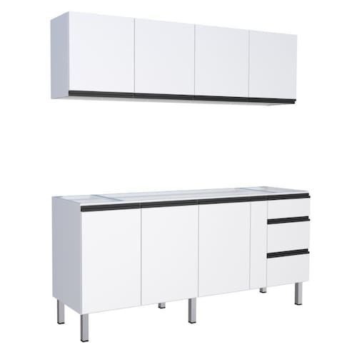 AçoEsse Conjunto de Armáro Suspenso e Balcão destaca-se por sua praticidade e eficiência de uso, podendo ser utilizada como complemento de cozinha.