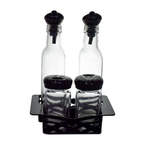 Dimensões: 2 Galheteiros: 20cm de altura x 4,5cm de diâmetro x 2,5cm de diâmetro da boca Capacidade: 250ml 2 Porta Condimentos: 9,5cm altura x 4cm de diâmetro x 4cm de diâmetro da boca