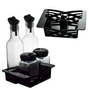 O vidro transparente oferece uma visualização clara do conteúdo e ajuda na identificação rápida dos ingredientes, enquanto as tampas pretas com acabamento fosco garantem um toque de modernidade ao conjunto. O destaque fica por conta dos bicos dosadores dos galheteiros, que facilitam o uso de líquidos como azeite e vinagre, oferecendo um fluxo contínuo e preciso, sem desperdício.