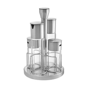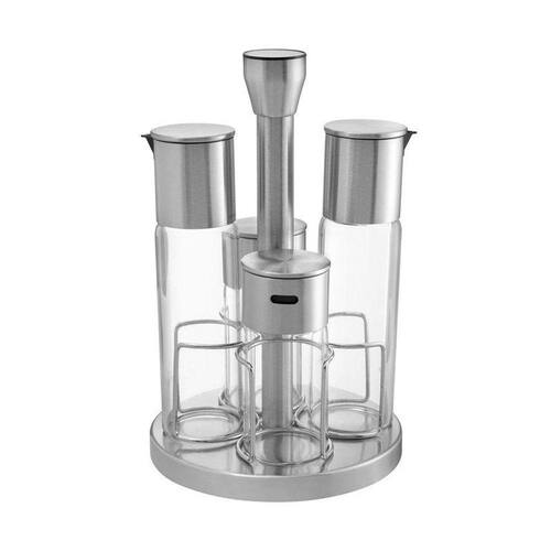O jogo de galheteiro Season vem com 4 frascos para inserir azeite e vinagres e um suporte de apoio para os recipientes. O maior frasco conta com capacidade de 120 ml. São produzidos em vidro, já as bases, tampas e suporte são feitos em aço inoxidável.