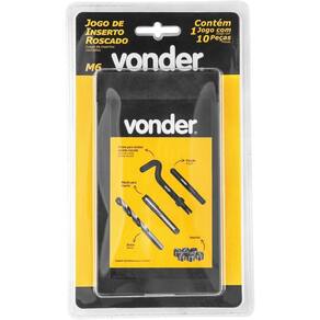 Marca: VonderConteúdo da Embalagem:1 Jogo composto por: 1 macho para inserto M6, 1 broca 6,3 mm, 1 ferramenta para instalar inserto roscado, 1 punção e 6 insertos M6 x 6 mmDestaques e diferenciais:Inserto confeccionado em aço inox 304Aplicações e dicas de uso:Indicado para recuperar roscas danificadasCaracterísticas Técnicas:Material do inserto: Aço inox 304 Medida da rosca do inserto mm : M6 Comprimento do inserto: 6 mm Tipo da rosca do inserto: MA / MG - Milímetro rosca grossa Passo da rosca: 1,00 mm
