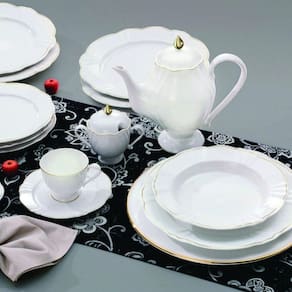 - 6 Pratos Rasos6 Pratos Fundos6 Pratos para Sobremesa6 Xícaras para Chá6 Pires