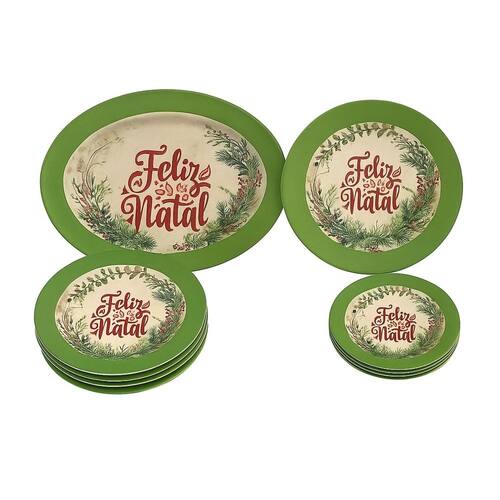 Celebre o Natal com charme e praticidade com o Jogo de Jantar 10 Peças em Melamina. Com estampas natalinas encantadoras e variadas — Floresta de inverno, Quebra-Nozes, Feliz Natal Verde e Feliz Natal Vermelho — ele traz um toque festivo e acolhedor para a sua mesa.Fabricado em melamina de alta qualidade, o conjunto é leve, resistente e fácil de limpar, ideal para uso no dia a dia ou para compor uma mesa temática especial nas festas de fim de ano.Leve o espírito natalino à sua mesa e surpreenda seus convidados com um jogo de jantar que une beleza, praticidade e durabilidade.Características:Material: Melamina (não vai ao micro-ondas)Leve e resistente a quedasSuperfície lisa e fácil de limparEstampas natalinas exclusivas que encantam em qualquer ocasiãoComposição do Jogo (10 peças):1 Petisqueira Oval – 35 x 25 cm1 Petisqueira Redonda – 35 cm de diâmetro4 Pratos de Jantar – 25 cm de diâmetro4 Pratos de Sobremesa – 17,5 cm de diâmetro Marca: Não Informado