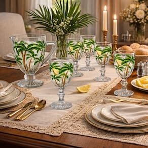 Jogo com jarra e taças em vidro transparente, com delicados detalhes de coqueiros em tons de verde. Um conjunto elegante e moderno, ideal para servir água, sucos e bebidas refrescantes, trazendo charme e sofisticação à mesa posta em qualquer ocasião.