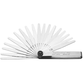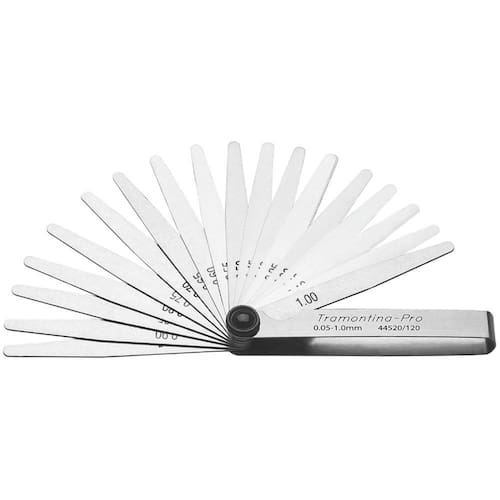 Além dos trabalhos de calibração, as lâminas são muito usadas no controle de folga de equipamentos automotivos, de aviação, a diesel e agrícola. Uso específico em ajustes de tuchos, velas, pontos do distribuidor, verificação de folgas em rolamentos e engrenagens, ajuste de pistões, anéis e pinos, calibração de canais estreitos, etc. Possui sistema de trava que permite segurar firmemente uma ou mais lâminas em posição. Quem é PRO usa. Orientações Corpo em aço inoxidável.Lâminas em aço alto carbono temperadas.Comprimento das lâminas de 100mm.Acabamento cromado.Jogo com 20 lâminas de espessura de: 0,05; 0,10; 0,15; 0,20; 0,25; 0,30; 0,35; 0,40; 0,45; 0,50; 0,55; 0,60; 0,65; 0,70; 0,75; 0,80; 0,85; 0,90; 0,95 e 1,00 mm.Lâminas aferidas individualmente.Possui sistema de trava que permite segurar firmemente uma ou mais lâminas em posição.As lâminas podem ser facilmente removidas ou substituídas.Usado no controle de folga de equipamentos automotivos, de aviação, a diesel e agrícola, trabalho de calibração e experimental.Uso específico em ajustes de tuchos, velas, pontos do distribuidor, verificação de folgas em rolamentos e engrenagens, ajuste de pistões, anéis e pinos, calibração de canais estreitos, etc.Ferramentas produzidas e testadas conforme normas especificas. Observações Use óculos, luvas e outros equipamentos de proteção individual (EPIs) de acordo com a tarefa a ser executada. Armazene em local limpo e seco. Características Gerais EAN13 7891114092790 DUN14 17891114092797 NCM 9017.30.90 Peso Líquido 0,1100 kg. Peso Bruto 0,1100 kg. Metragem 0,000413 m³. Dimensões Embalagem (Compr. X Larg. X Alt.) 220x 75x 25 mm. Dimensões Produto (Compr. X Larg. X Alt.) 108x 13x 13 mm. Dimensão Extra A 13,0 mm. Dimensão Extra B 13,0 mm. Dimensão Extra C 108,0 mm.
