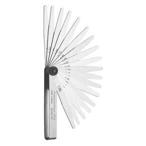 Além dos trabalhos de calibração, as lâminas são muito usadas no controle de folga de equipamentos automotivos, de aviação, a diesel e agrícola. Uso específico em ajustes de tuchos, velas, pontos do distribuidor, verificação de folgas em rolamentos e engrenagens, ajuste de pistões, anéis e pinos, calibração de canais estreitos, etc. Possui sistema de trava que permite segurar firmemente uma ou mais lâminas em posição. Quem é pro usa. Corpo em aço inoxidável. Lâminas em aço alto carbono temperadas. Comprimento das lâminas de 100mm. Acabamento cromado. Jogo com 20 lâminas de espessura de: 0,05. 0,10. 0,15. 0,20. 0,25. 0,30. 0,35. 0,40. 0,45. 0,50. 0,55. 0,60. 0,65. 0,70. 0,75. 0,80. 0,85. 0,90. 0,95 e 1,00 mm. Lâminas aferidas individualmente. Possui sistema de trava que permite segurar firmemente uma ou mais lâminas em posição. As lâminas podem ser facilmente removidas ou substituídas. Utilizado no controle de folga de equipamentos automotivos, de aviação, a diesel e agrícola, trabalho de calibração e experimental. Uso específico em ajustes de tuchos, velas, pontos do distribuidor, verificação de folgas em rolamentos e engrenagens, ajuste de pistões, anéis e pinos, calibração de canais estreitos, etc. Ferramentas produzidas e testadas conforme normas especificas. Além dos trabalhos de calibração, as lâminas são muito usadas no controle de folga de equipamentos automotivos, de aviação, a diesel e agrícola. Uso específico em ajustes de tuchos, velas, pontos do distribuidor, verificação de folgas em rolamentos e engrenagens, ajuste de pistões, anéis e pinos, calibração de canais estreitos, etc. Possui sistema de trava que permite segurar firmemente uma ou mais lâminas em posição. Quem é pro usa.