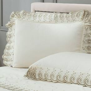Detalhes Ricamente Bordados: A vira do lençol de cima e as abas das fronhas possuem um lindo e detalhado bordado, que confere um visual luxuoso e de alta decoração à sua cama.