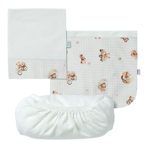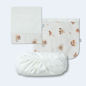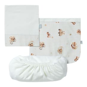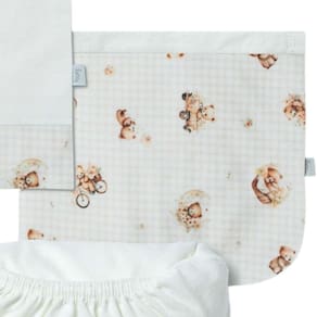 O jogo de lençol 03 peças Hug traz conforto e cuidado para o quartinho do bebê. O kit possui um lençol de elástico, uma fronha e um sobre lençol com vira em suedine estampado. Além disso, o sobre lençol é ótimo para cobrir o bebê. Indicado para berço padrão americano. Diferenciais: Suedine e meia malha com nanotecnologia que agrega maciez e tratamento antibacteriano e antifúngico; Estampa rotativa exclusiva Hug. MEDIDAS: Lençol de elástico: 70cm x 130cm x 14cm Fronha: 40cm x 30cm Sobre lençol: 98cm x 170cm. CARACTERÍSTICAS: Meia malha 100% algodão;