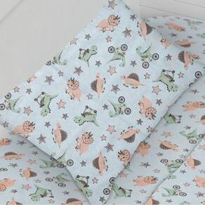 Conteúdo e Medidas: Jogo de Lençol Malha Berço Americano - Dino Bike - 02 Peças 01 - Lençol Malha Baby Estampado c/ Elástico (70cm x 130cm x 12cm) 01 - Fronha Malha Estampada (30cm x 40cm)