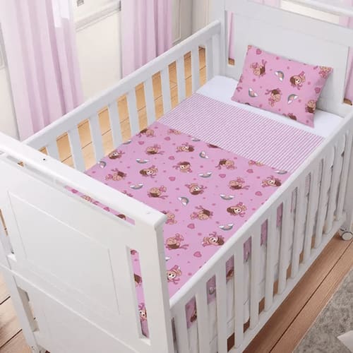 A terceira peça é a fronha, que é usada para cobrir o travesseiro do berço. Assim como o lençol de cima, ela é estampada com os personagens da Turma da Mônica, tornando o ambiente do berço mais divertido e alegre para o bebê.