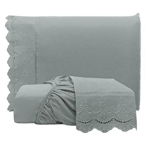 O destaque fica por conta do delicado bordado inglês nas fronhas, que adiciona charme e elegância ao conjunto, tornando-o perfeito para compor uma cama sofisticada e acolhedora. Ideal para quem aprecia o equilíbrio entre requinte e bem-estar no ambiente do quarto.