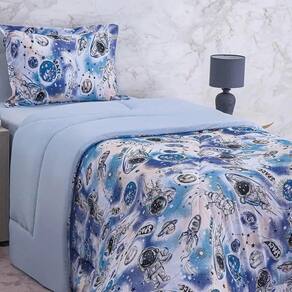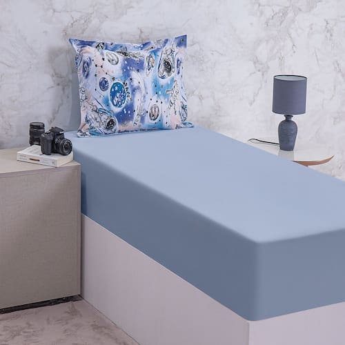 Conteúdo: 1 Lençol com elástico liso na cor azul e 1 fronha estampada