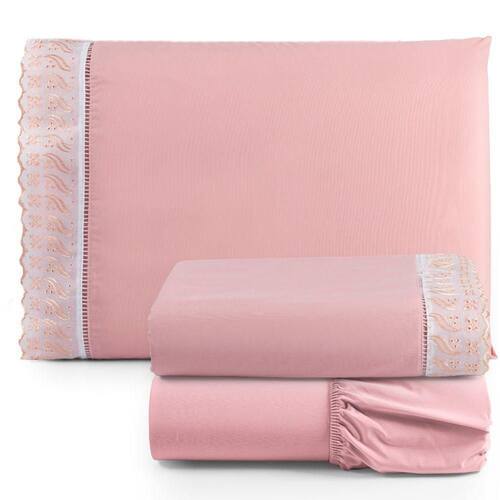 Jogo De Lençol Solteiro 3 Peças Basic Percal 180 Fios Lese Bordado Inglês - Rosa - Única