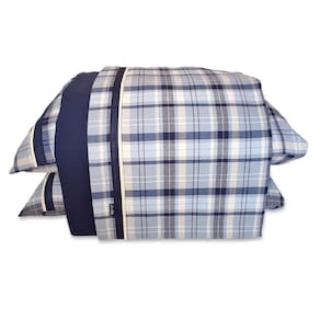 Jogo de lençol CASAL com 4 peças: 02 fronhas, 01 lençol com elástico, 01 lençol de cima - Medidas do lençol de elástico: 1,40 x 1,90 x 0,30 m - Medidas do lençol de cima: 2,20 x 2,40 m - Medidas da fronha: 50 x 70 cm - Cor do lençol de cima: xadrez azul com branco - Cor do lençol de elástico: azul marinho - Tecido: Flanela Cataguase 100% algodão - Enchimento para os travesseiros não incluso - As cores podem sofrer alterações conforme a configuração de sua tela
