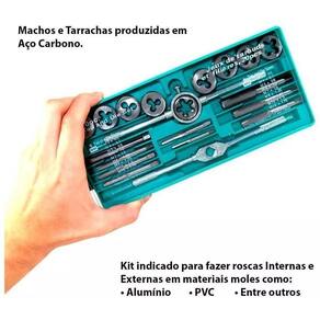 Jogo De Macho E Tarracha Com 20 Peças Estojo Características: -produzido em aço Carbono. -resistente a ferrugem. -tratamento industrial. -acompanhado com uma maleta verde. -mecanismos de precisão para padrões exatos. -com superfície polidas que facilita remoção de lascas. -contém 20 peças. Materiais Indicados: -alumínio, Madeira, PVC, Plástico, Latão, Metais Moles, Bronze, Entre Outros. Conteúdo: Contém 20 peças, sendo: -1 Chave manual ajustável. -1 Chave manual para tarracha. -9 Machos: M3x0,5, M4x0.7, M5x0.8, M6x1.0, M7x1.0, M8x1.25, M9x1,25, M10x1.5, M12x1.75mm. -9 Tarrachas: M3x0.5, M4x0.7, M5x0.8, M6x1.0, M7x1.0, M8x1.25, M9x1,25, M10x1.5, M12x1.75mm. Aplicação: O Jogo De Macho E Tarracha é indicado para confeccionar roscas internas macho e roscas externas tarracha , recomendado para uso hobby. Machos são ferramentas que tem a função de gerar roscas internas em furos para o rosqueamento de parafusos. Essas ferramentas são fabricadas em aço carbono. O macho pode ser aplicado de forma manual ou em máquina. Os machos manuais são mais curtos que os machos para máquina e compostos por jogos de duas peças para rosca fina e três para roscas normais. No rosqueamento com macho manual, o movimento de corte giratório é feito com o auxilio de uma chave a fim de abrir ou alargar furos. O macho para aplicação em máquina é geralmente de uma única peça e o movimento de corte giratório é feito por meio de cabeçotes rosqueadores. As Tarrachas são ferramentas que tem a função de gerar roscas externas em eixos, parafusos e tubos para união com porcas. Essas ferramentas são fabricadas em aço carbono. O Jogo Macho E Tarracha pode ser em metal mole, alumínio, PVC, madeira, plástico, latão, bronze e entre outros. Marca: DM Ferramentas e equipamentos automotivos