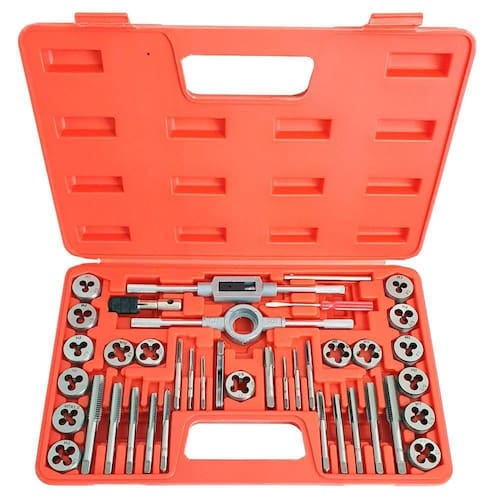 Kit com 40 peças de machos e tarrachas 00054 charbs. Completo e perfeito para criar novas roscas ou reparar roscas danificadas na maioria dos metais, como aço carbono, ferro fundido, alumínio, latão, cobre e aço inoxidável, plástico, etc.