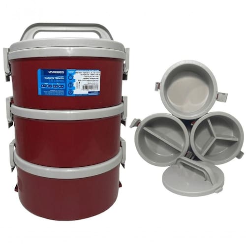 JOGO DE MARMITAS TÉRMICA DIVISÓRIAS 3 PEÇAS 1,5 LITROS AZULMarca: SOPRANOPequenos cuidados com seu lar fazem toda a diferença.Presilhas para no TransportePode ir às Micro-ondas (sem a tampa)Livre de BPAPeso: 900 gramas / Cor: Bege com Marrom e Azul com BegeDimensões Internas de cada Prato: 17cm (D) x 7cm (A)Dimensões Externas: 22 cm (C) x 20,5 cm (L) x 48,5 cm (A)Capacidade por marmita: 1,5 LitrosEficiência Térmica: Até 4 horasConteúdo: 1 marmitas sem divisórias, 1 marmita com 1 divisória, 1 marmita com 3 divisórias e 1 tampa* com Micro-ondas (Aquecer sem a tampa)Material: