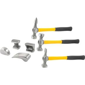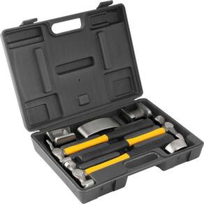 1 Jogo composto por maleta plástica com 7 peças, sendo: 1 martelo chapeador pena reta, 1 martelo chapeador ponta curta, 1 martelo chapeador faces planas, 1 tasso curvado, 1 tasso trilho, 1 tasso maçaneta e 1 tasso salto