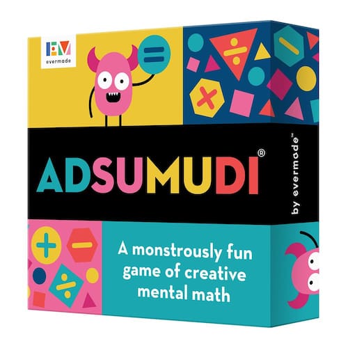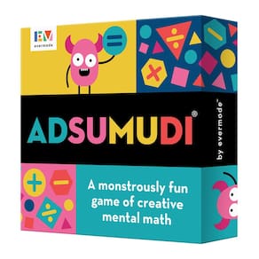 Você consegue descobrir como Adsumudi recebeu esse nome? Dica: tem a ver com adição, subtração, multiplicação e divisão. E é exatamente assim que você joga! Encontre o caminho matemático secreto para a resposta de Adsumudi em cada cartão adicionando, subtraindo, multiplicando e dividindo os outros cinco números. Existem várias maneiras de jogar Adsumudi para acomodar diferentes níveis ou simplesmente para manter as coisas interessantes! Comece no modo fácil, que exige que os jogadores usem apenas 2 números para igualar a resposta de Adsumudi, e vá até o modo médio (3 números) e o modo difícil (4 números) até o modo monstruosamente difícil, onde os jogadores precisam usar todos os 5 números para igualar a resposta de Adsumudi! Por exemplo, digamos que a resposta de Adsumudi seja 6 e os outros cinco números em um cartão sejam 1, 2, 3, 4 e 5. Se você estiver jogando no modo fácil, sua solução pode ser 2 + 4 = 6. No modo médio, você poderia dizer (4 x 3) ÷ 2 = 6. No modo difícil, você pode usar 4 + (3 - 2) + 1 = 6. Ou se você estiver jogando no modo extremamente difícil, sua solução pode ser (2 x 5 x 3) ÷ (1 + 4) = 6. Desafie seus amigos correndo para ver quem consegue encontrar a solução mais rapidamente. Guarde as cartas que você descobrir primeiro e colete 5 para ganhar! Ou trabalhe de forma colaborativa para resolver desde o modo fácil até o monstruosamente difícil para cada cartão. Os números só podem ser s uma vez em uma determinada equação, mas os jogadores podem usar qualquer combinação de adição, subtração, multiplicação e divisão que precisarem. Cada carta tem pelo menos uma solução para cada nível (fácil, médio, difícil, monstruosamente difícil), mas geralmente há várias maneiras de encontrar a resposta de Adsumudi em um determinado nível. Dos criadores do Proof! Jogo de matemática, Adsumudi certamente será o favorito entre professores de matemática e pais, perfeito para noites de jogos em família e em sala de aula, incluindo ensino remoto e ensino doméstico.