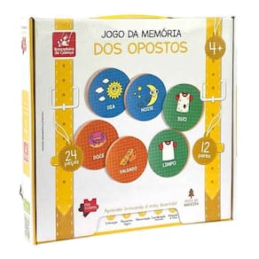 Jogo Aprendendo os Opostos - Brincadeira de CriançaA criança se diverte enquanto aprende a associar figuras opostas. Com 24 peças em madeira, as crianças vão adorar brincar com esse jogo educativo.*As cores do produto podem variar das apresentadas nas fotos.Especificações TécnicasMarca: Brincadeira de CriançaIdade recomendada: A partir de 4 anosComposição / Material: Madeira MDFAção do Brinquedo depende de pilhas ou baterias: NãoBrinquedo se movimenta com a ajuda da criança: SimBrinquedo com Luz: NãoBrinquedo com Som: NãoBrinquedo com voz: NãoConteúdo da embalagem: 24 Peças Madeira (12 Pares)Dimensões aproximadas de cada peça: Altura 6cm x Largura 6cmDimensões aproximadas da embalagem: Altura 5cm x Largura 26cm x Comprimento 26cmCertificação: Registro 006332/2021 OCP0133