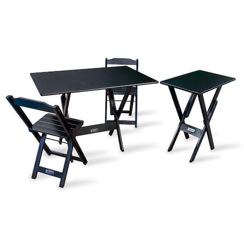 Jogo De Mesa 1,10x70 Com 2 Cadeiras E Mesa Aparador Tarimatã - Pretoé ideal para bares, restaurantes, estabelecimentos, áreas de lazer e também para sua casa. Em madeira tornando-os resistentes e duráveis. Seu design permite que esse conjunto seja encaixado em qualquer ambiente, trazendo um toque a mais para seu estabelecimento. Além de sua durabilidade, o que lhe trará conforto para servir seus clientes. Por ser dobrável torna-se mais fácil guardar, manusear e limpar o produto.Atenção: EVITE USAR PRODUTOS ABRASIVOS E QUÍMICOS PARA LIMPEZA DO PRODUTO, aconselha-se o uso de pano umedecido para melhor conservação mantenha o produto fora de chuva e sol constantes.*imagens meramente ilustrativas*Medidas Mesa:Tampo 108,5 x 67,5 cm Altura 77cmDimensões Cadeira:Altura da cadeira aberta 78cm Altura da cadeira fechada 89cm Altura até o assento 46cm Largura 41,5cm Largura vão do assento 37,5cm Profundidade 40cm Profundidade do assento 32cmJogo de Mesa 1,10x70 com 2 Cadeiras e Mesa Aparador Tarimatà - Preto