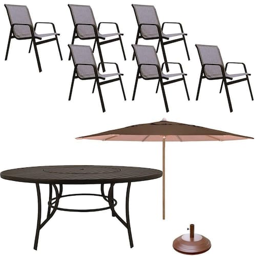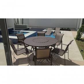 O Conjunto de Mesa Ripada de Alumínio com Centro Giratório Interno com 6 Cadeiras de Alumínio com Tela Sling e Guarda Sol, é a escolha perfeita para quem busca aliar sofisticação e funcionalidade em espaços ao ar livre ou internos.