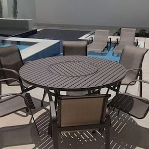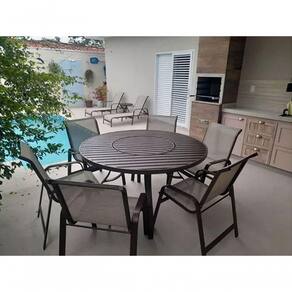 Este conjunto eleva a experiência de refeições ao ar livre, trazendo um toque de modernidade e conforto. Ideal para área externa de casa, sitio, condomínio, hotel e pousada, seja na varanda, jardim, quintal, sacadas de apartamentos e beira de piscina. A mesa ripada, com seu centro giratório interno no mesmo nível da mesa, é ideal para jantares em família e confraternizações com amigos, permitindo um acesso prático e dinâmico aos pratos, promovendo interação e sociabilidade. Sua estrutura em alumínio é leve, mas resistente, garantindo durabilidade e fácil manuseio.
